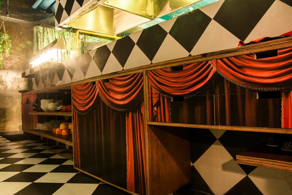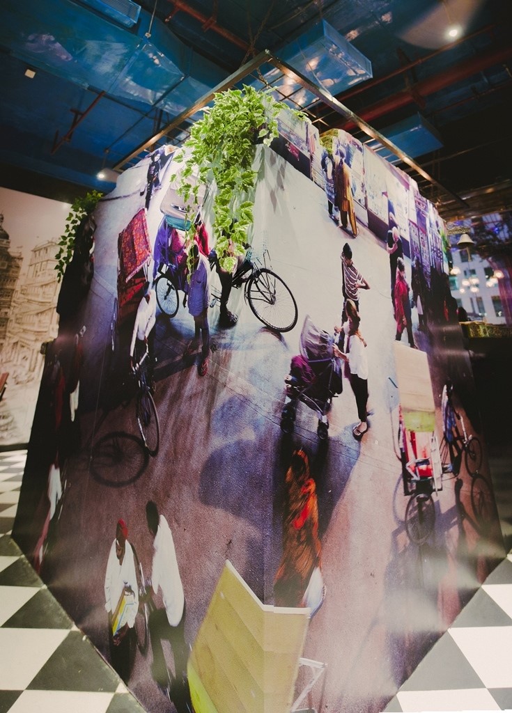 A speciality Indian restaurant. This restaurant is seen from the eyes of an Indian living elsewhere and is capsized as nostalgia. Sitting in a very different environment the images flash through the eyes. Hence a very industrial atmosphere with multiple images of India every in form of mannequins and graphics.