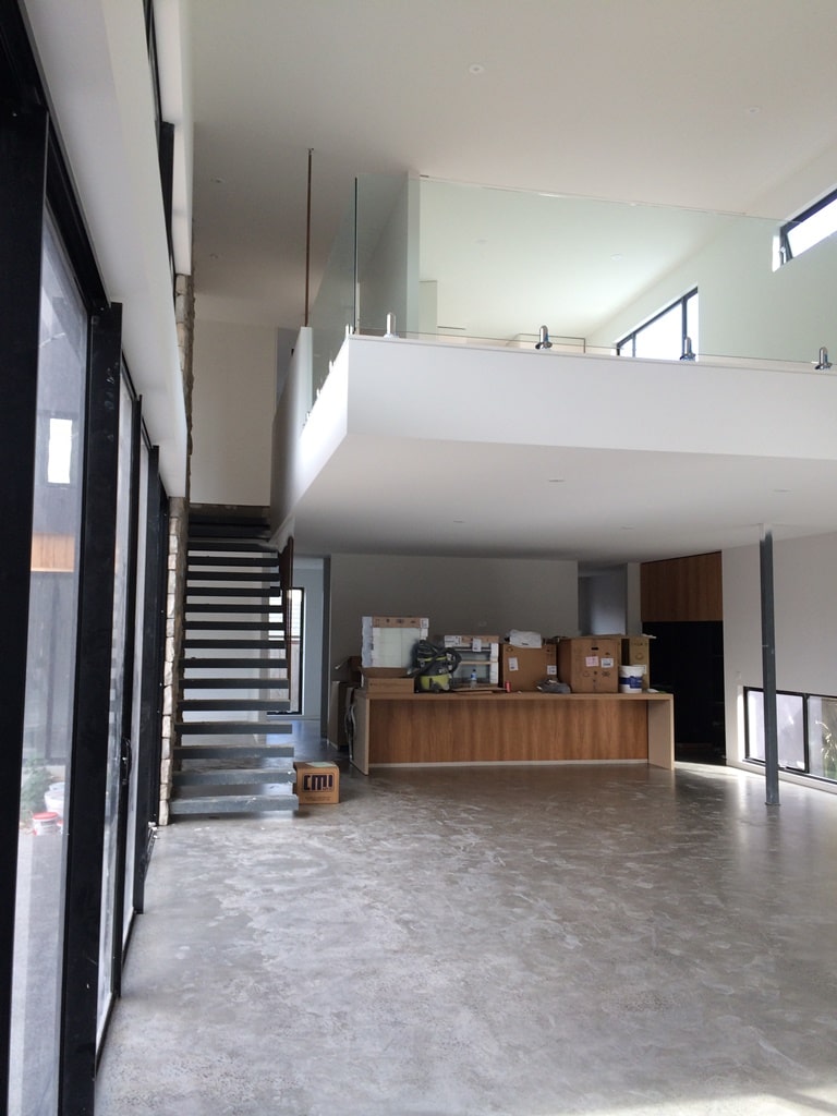 The house is designed as a series of courtyards integrating the open spaces with the built areas. A double-height atrium integrates the 2 levels and an almost floating staircase connects them.